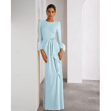 Strak kolom Tot de grond Galajurken Avondjurken Baljurk Formele kleding Elegant Vintage Lange mouw Strakke ronde hals Bruiloft Formeel Afneembaar Stretch crêpe met Veer