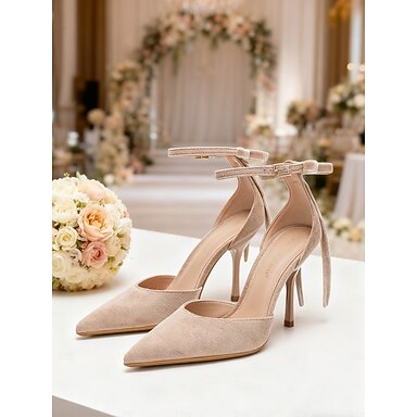 Damesko i nude semsket skinn med ankelknyting – elegante pumps med spiss tå for innendørs bryllup, bryllupsgjester og pene formelle festsko