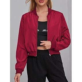 Dame Bomberjakke Bekvem Pustende Glidelås Fritid عادي Feriereise Gate Avslappet Dagligdagstøy Glidelås Kort Høy krage Normal Langermet Yttertøy Svart Rød Militærgrønn Vår Høst