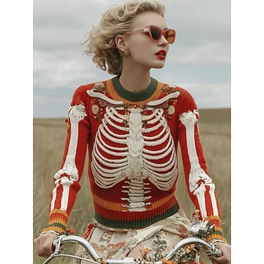 Damegenser Skeletthode Motemessig Uformell Grafikk Skeletthode Rund Hals Strikket Lang Erme Regular Topper Strikket Rød Blå Høst Vinter