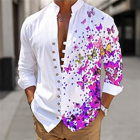 Herre Sommerfugl Skjorte Linskjorte Langermet Fritid Dagligdagstøy Ut på byen Helg Vår Opprett krage Trykt mønster Knapp ned Blå Lilla Oransje