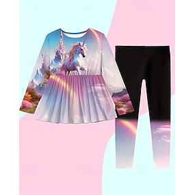 Jente 3D enhjørning Sett T-skjorte og Legging Langermet Sommer Vår Mote Daglig Grunnleggende Barn 4-12 år Crew-hals utendørs Feriereise Skreddersydd