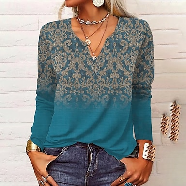 Dame Skjorte Blomstret Grafisk Årgang Stilfull V-hals Lange topper Avslappet Daglig Ferie Blå Grønn Kakifarget Lyseblå Sommer Vår