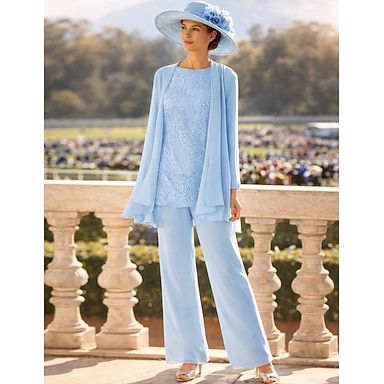 Buksedrakt 3 -delt drakt Gulvlengde Kjole til brudens mor Ermeløs Halsbåt Elegant Plusstørrelse Innpakking inkludert Formell Bryllupsgjest Chiffon med Blonder