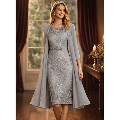 Kjolesett Kne-lengde Bryllupsgjestkjole Mor til bruden Kjole Langermet Rundhals Elegant Enkel Bryllupsgjest med Ensfarge