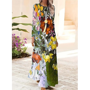 Dame Maxikjole Skiftkjole Kjole med A-linje Fest Fritid Bohem Daglig Stevnemøte Ut på byen Normal Blomstret Grafisk Batikkfarget Langermet Crew-hals Blå Rød Grønn Vår Høst Vinter