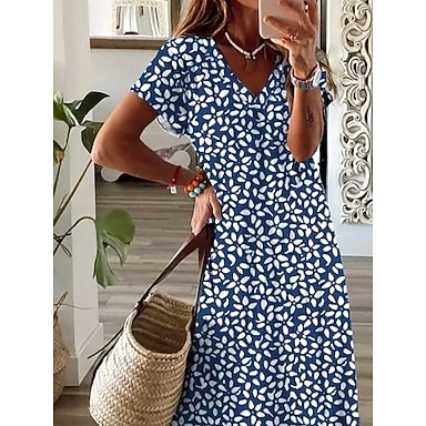 Dame Maxi Kjole A-Linje Kjole Sommerkjole Elegant Ferie Fritids Feriedaglig Vanlig Passform Blomster Grafisk Prikkete Kort Erme V-Hals Støvet Blå Sommer Vår Høst
