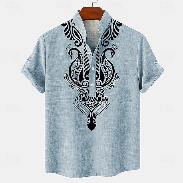 Herre linskjorte Henly-skjorte retro skjorter Vintage skjorte Etnisk skjorte Etnisk Daglig Ferie Blå Beige Grå Kortermet Kinesisk Krave Sommer Vår Klær Trykt mønster