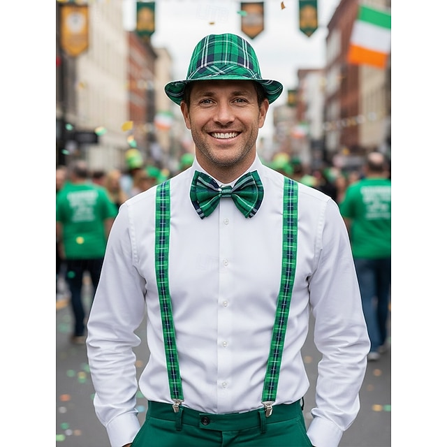 Herrekostymetilbehørssett til St. Patricks dag, sett med grønn rutete hatt, sløyfe og bukseseler, polyestermateriale med flere mønstre, irsk festivalparade og festantrekk for menn