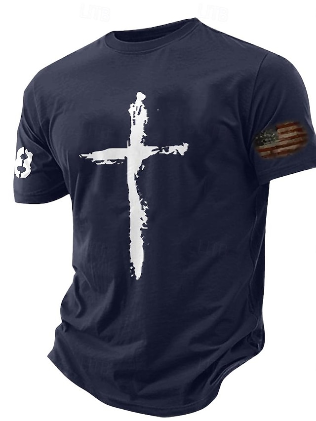 Menns Patriotisk Tro T-skjorte med Slitt Kors Amerikansk Flagg Graphic Kortermet Marineblå