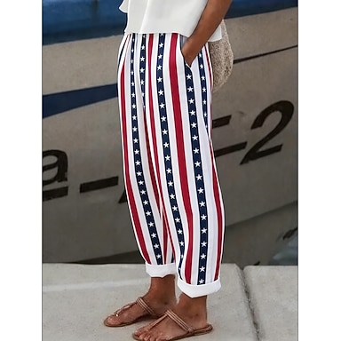 Uavhengighetsdag Patriotisk Dame Bukser Bukser Ferie Vintage Etnisk Stil Full Lengde Høy Midje Bukser Blomstrete Amerikansk Flagget Snor Side Lommer Trykk Pusteevne Komfortabel Ikke-elastisk
