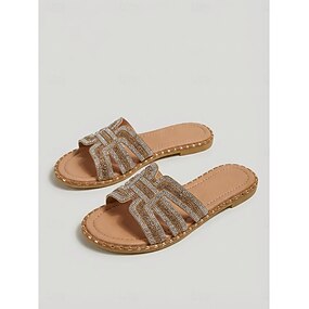 damesandaler med champagnefarget strass - flate tøfler med glitrende juveler for luksushotellferier og strandkvelder &sommerferieklær