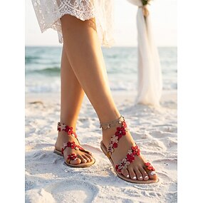 Damesandaler med røde blomstermotiver i bohemsk-farget materiale for stranden – flate, omsluttende gladiatorer med gullfargede blomsterdetaljer til sommerferien &fester