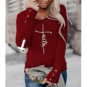 Dame T skjorte Burgund t-skjorte Knapper Grafisk Langermet Rund hals Vanlige topper Avslappet Svart Hvit Vin Høst vinter faith