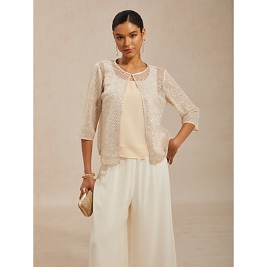 Dame Skjorte Singleter Tvillingsett Blondér Paljetter Netting Elegant 3/4 ermer Crew-hals Bryllupsgjest Cocktail antrekk Champagne Sommer Vår Høst