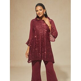 Dame Blondeskjorte Tunika Blondeskjøtetopp Bluse Paljetter Blonde Drapering Elegant Daglig damer 3/4 ermer Sommerfuglermer Båthals Høyhalset Lange topper Bryllupsgjest Ferie Vin Vår Høst Vinter