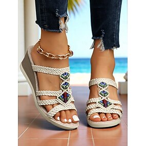 kvinners vevde kile-skyvesandaler med flerfargede perler – boho chic strand- og resortsko for ferie eller hverdagskomfort