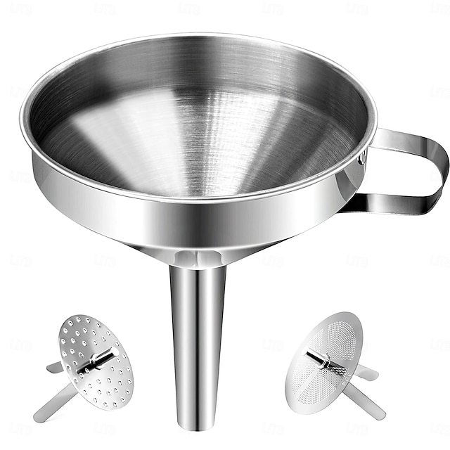 Package include: 1 x stanless steel funnel, 2 x detachable strainer.