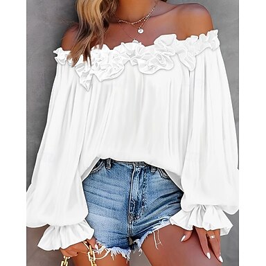 Damskie Koszula Bluzka Sztuczna bawełna len Falbana Odkryte plecy Równina Nowoczesny Codzienny Długi rękaw Z odsłoniętymi ramionami Zwykłe topy Codzienny Święto Wyjściowe Niebieski Czarny Biały