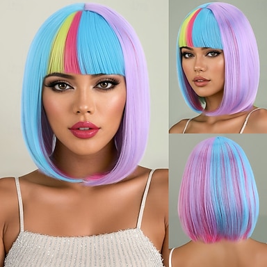 Peruka karnawałowa 2026 Wielokolorowy Prosta Bob Krótkie Peruka syntetyczna festiwalowa Mardi Gras Parada Włosy do kostiumu cosplay na Damskie