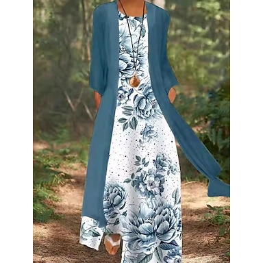 Damskie Zestaw sukienek Codzienne sukienki Sukienka z nadrukiem Moda Codzienny Kwiaty Nadruk Długa sukienka sukienka maxi Rękaw 3/4 W serek Codzienny Na zewnątrz Niebieski Rumiany róż Błękit nieba