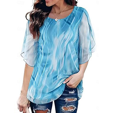 Damskie Koszula Bluzka Niejednolita całość Siateczka Nadruk Kwiaty Codzienny Rękaw 3/4 Półgolf Zwykłe topy Codzienny Niebieski Czarny Wino Lato Wiosna