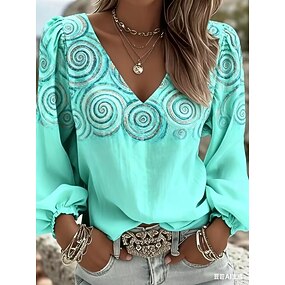 Damskie Koszula Koszula Boho Nadruk Graficzny W Tureckie Wzory Elegancja Bohema Urlop Długi rękaw W serek Zwykłe topy Codzienny Święto Wyjściowe Zielony trawiasty Biały Jasnozielony Rumiany r
