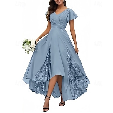 Krój A Asymetryczna Sukienki dla gości weselnych Elegancja Krótki rękaw W serek Gość weselny Zaręczynowy Szyfon Koronka z Krzyżowe Z marszczeniami