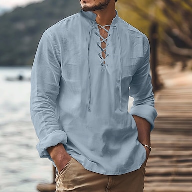 Męskie Koszula Styl Wikingów Letnia koszula Stroje plażowe Koszulka piracka Jednokolorowe Urlop Ulica Czarny Granatowy Khaki Długi rękaw Kołnierz stawiany Lato Wiosna Odzież Ściągana na sznurek