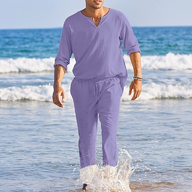 Męskie Koszula Koszula z lnu bawełnianego 2 elementy Zestaw koszul Letnia koszula Koszula plażowa Równina Codzienny Hawajskie Czarny Biały Granatowy Khaki Krótki rękaw W serek Lato Odzież