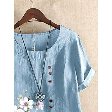 Camisa Feminina Camisa de Linho Blusa Floral Linho Vintage Casual Manga Curta Gola Redonda Tops Regulares Diários Saindo Botões Azul Claro Verão Primavera