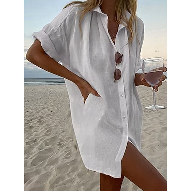 Mulheres Camisa Social Mistura de Algodão camisa Boho Botão para cima Tecido Casual Estilo Praia Manga Curta Colarinho de Camisa Tops regulares Preto Branco Amarelo Rosa Azul Céu Verão