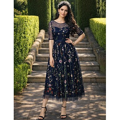 Vestido Floral em A Convidada de Casamento Dia dos Namorados Chiffon até o Chá Meia Manga Ilusória Decote Renda com Aplicações Bordadas