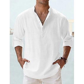 Homens Camisa Social Camisa de linho de algodão Camisa de algodão branco Camisa casual Tecido Havaiana Feriado Preto Branco Amarelo Azul Marinha 3/4 de Manga Decote V Primavera Verão Roupa