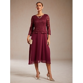 Mulheres Vestido midi Vestido A Line Elegante Festa de Noite Convidado do casamento Renda Normal Côr Sólida Manga 3/4 Gola Redonda Vinho