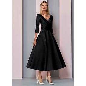 Linha A Longuette Vestidos de cocktail Vestidos de festa Elegante Vintage Tamanhos Grandes Manga 3/4 Decote V Convidado do casamento Cetim com Pregas 2025