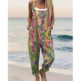 Mulheres Normal Macacão Roupa de rua Floral Sem Manga Decote U Bolsos Imprimir Para Noite Final de semana Normal Verde Verão