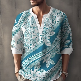 Homens polinésio Tribal Estampa floral Camisa Social Camisa Henley Túnica Manga Longa Vintage retrô Diário Ao ar livre Férias Verão Primavera Decote V Abotoar Impressão 3D Camisa tipo linho Azul