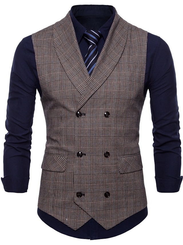 Homens Colete Colete de terno Casamento Trabalho O negócio Feriado Formal □ Gentil Primavera Outono Poliéster Xadrez Colarinho de Camisa Delgado Marron Cinza Claro Cinzento Escuro Colete