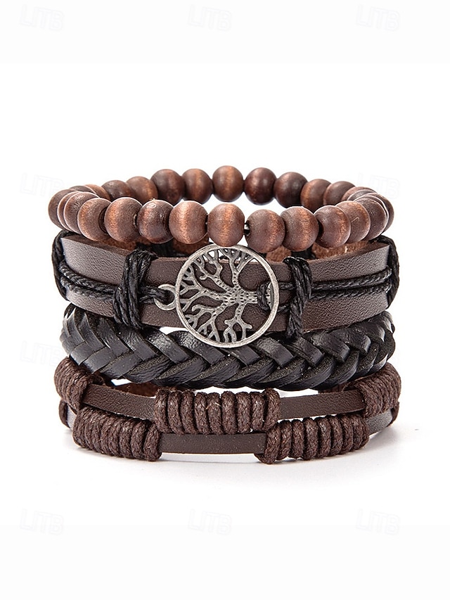 Conjunto de pulseiras masculinas multicamadas de couro genuíno – pulseira de punho de árvore da vida com contas boho para uso casual, festa e viagem