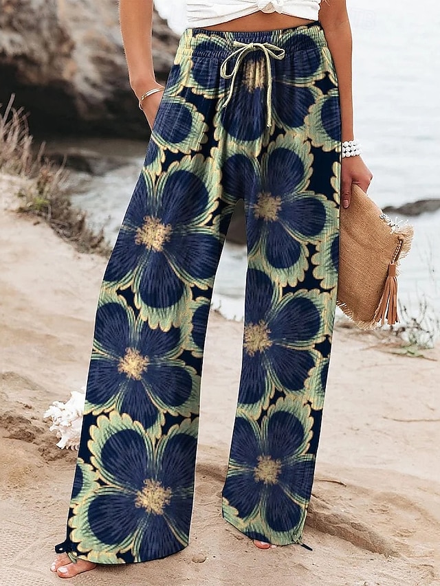 Mulheres Perna larga Calças Calça Palazzo Moda Roupa de rua Comprimento total Cintura Alta Flor Com Cordão Cintura elástica Imprimir Respirabilidade Confortável Rua Roupa Diária Para Noite Azul