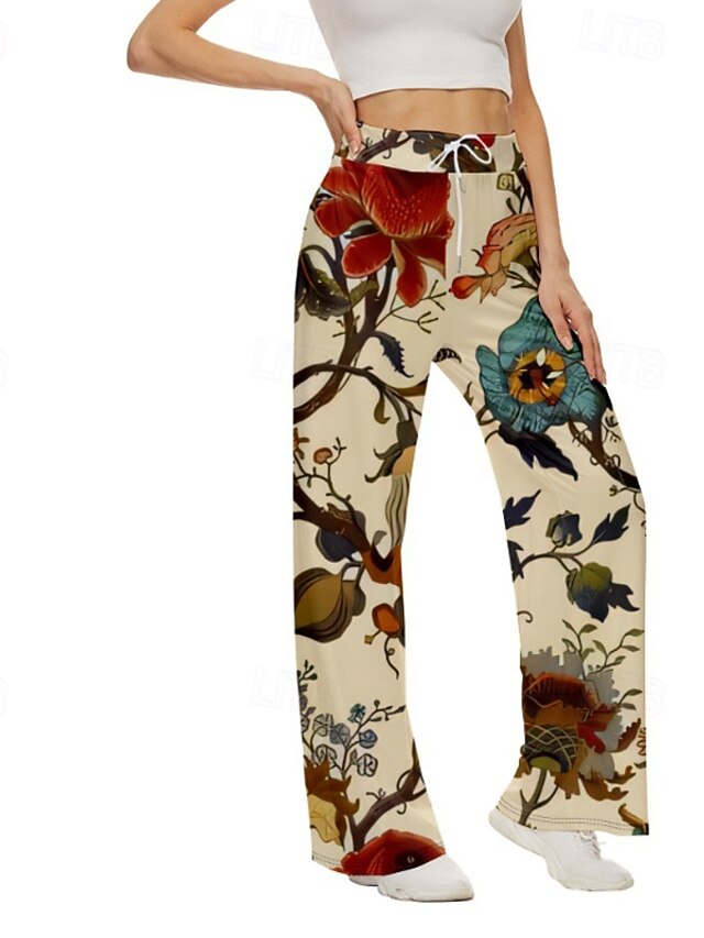 Mulheres Perna larga Calças Roupa de rua Casual Comprimento total Natural Flor Imprimir Design de cordão elástico Confortável Roupa Diária Final de semana Vermelho Outono Normal