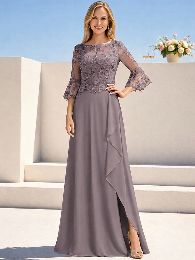 Linha A Longo Vestido de convidada de casamento Vestido formal Vestido de noite Vestido Para Mãe dos Noivos Manga Longa Gola Redonda Elegante Formal Convidado do casamento Noite Formal Chiffon com