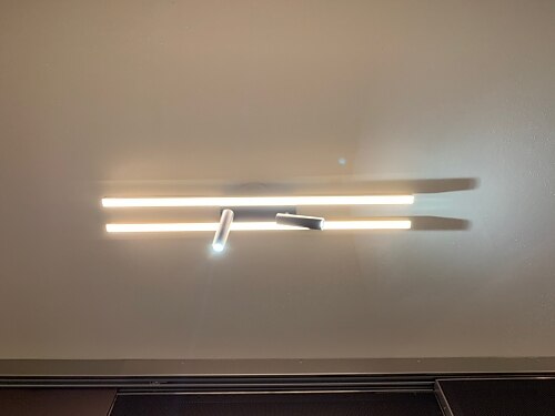 Looks like in the picture, be aware that the color temperature can only be controlled for the main lamp: the 2 spotlights stay cold. Looks like in the picture, be aware that the color temperature can only be controlled for the main lamp: the 2 spotlights stay cold.