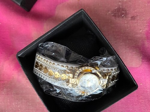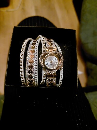 Exquisite design. Exactly as shown in the photos with a gold heart of rhinestones framing the 1-inch round quartz watch. The soft white leather band has been cut and split uniquely separate designed bracelet straps. The first strap has a row of gold dots, The center band features small gold hearts. The final separate strap has a string of tiny rhinestones. Two snaps allow one to adjust the wrist band size. Packaging allowed the various straps to cross over and get twisted, so lay flat and press under the weight of some books. Exquisite design. Exactly as shown in the photos with a gold heart of rhinestones framing the 1-inch round quartz watch. The soft white leather band has been cut and split uniquely separate designed bracelet straps. The first strap has a row of gold dots, The center band features small gold hearts. The final separate strap has a string of tiny rhinestones. Two snaps allow one to adjust the wrist band size. Packaging allowed the various straps to cross over and get twisted, so lay flat and press under the weight of some books.