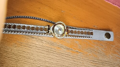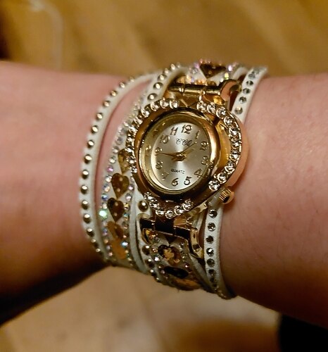 Exquisite design. Exactly as shown in the photos with a gold heart of rhinestones framing the 1-inch round quartz watch. The soft gray leather band has been cut and split uniquely separate designed bracelet straps. The first strap has a row of gold dots, The center band features small gold hearts. The final separate strap has a string of tiny rhinestones. Two snaps allow one to adjust the wrist band size. Packaging allowed the various straps to cross over and get twisted, so lay flat and press under the weight of some books. Exquisite design. Exactly as shown in the photos with a gold heart of rhinestones framing the 1-inch round quartz watch. The soft gray leather band has been cut and split uniquely separate designed bracelet straps. The first strap has a row of gold dots, The center band features small gold hearts. The final separate strap has a string of tiny rhinestones. Two snaps allow one to adjust the wrist band size. Packaging allowed the various straps to cross over and get twisted, so lay flat and press under the weight of some books.