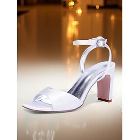 sandálias de casamento de salto bloco de cetim branco - sapatos de noiva abertos com tira no tornozelo