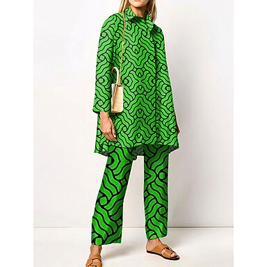 Conjunto de Camisa de Moda Elegante Vintage para Mulheres de 2 Peças Blusa Calças Conjunto Calças Manga Longa Gola de Camisa Estampa Gráfica Casual Diário Marinho Escuro Verde Trevo Outono e Inverno