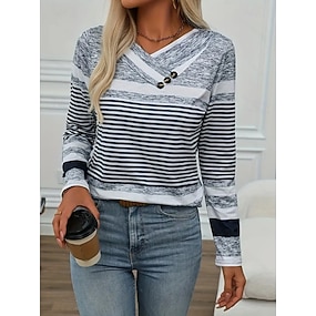 Mulheres Camiseta Listrado Moda à moda Básico Manga Longa Gola Redonda Tops regulares Diário Final de semana Botões Imprimir Azul Real Cáqui Cinza Claro Verão