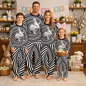 Olhar de família Páscoa Pijamas Gráfico Coelho Listrado Casual Imprimir Black-1 Black-3 Black-4 Manga Longa Férias Roupas Combinando